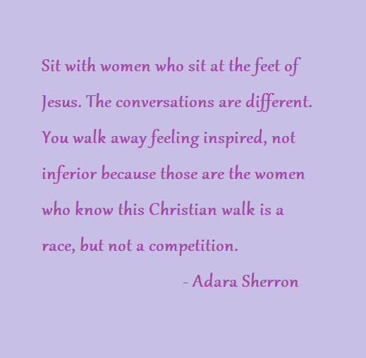 Even now, I love to sit at the feet of Jesus with the women who continually demonstrate the importance of spending time with Him. We learn from one another; we care for one another, we support one another; we love one another. Together we press on toward the goal to win the prize for which God has called us heavenward in Christ Jesus.