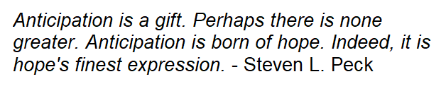 Waiting sounds a lot like patience … not my favorite word or practice! The dictionary defines patience as an ability or willingness to suppress restlessness or annoyance when confronted with delay. Anticipation, on the other hand, is defined as expectation or hope. I can easily become annoyed waiting for something, but hope and expectation cause me to experience joy at the coming of a good thing.