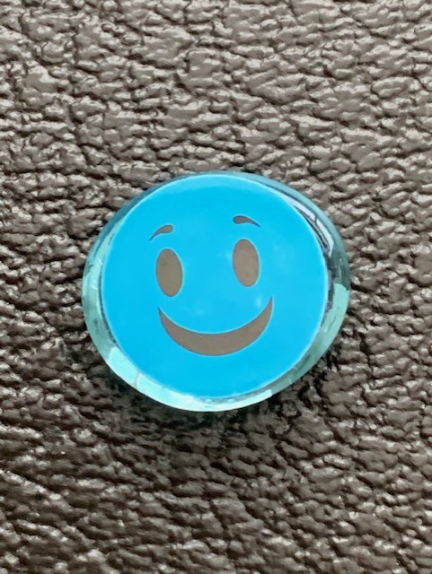 I limped the long way to the front door and tried to time my entry for when she was occupied talking with others. I failed. With all the skill of an Australian cattle dog she cut me away from the herd with extraordinary ease. Gathering my courage I was readying myself to say “no” to whatever she was selling. It turns out she was not really selling anything … she simply gave me a flat round glass piece with a blue happy face stuck to it and told me to have a good day. Well, that took the wind out of my refusal! I stowed the happy face in my pocket, thanked her, and moved on.